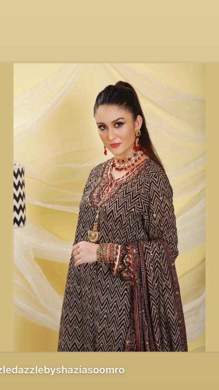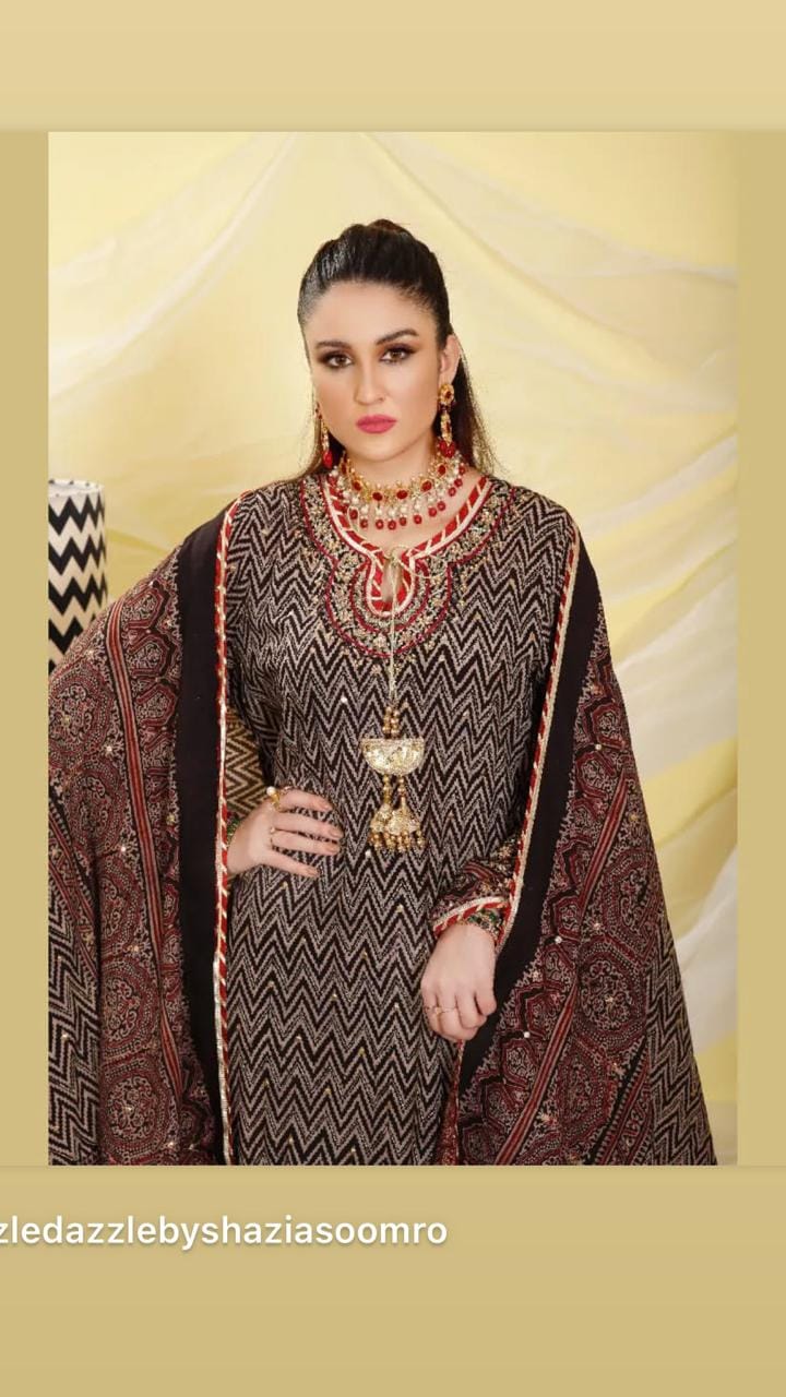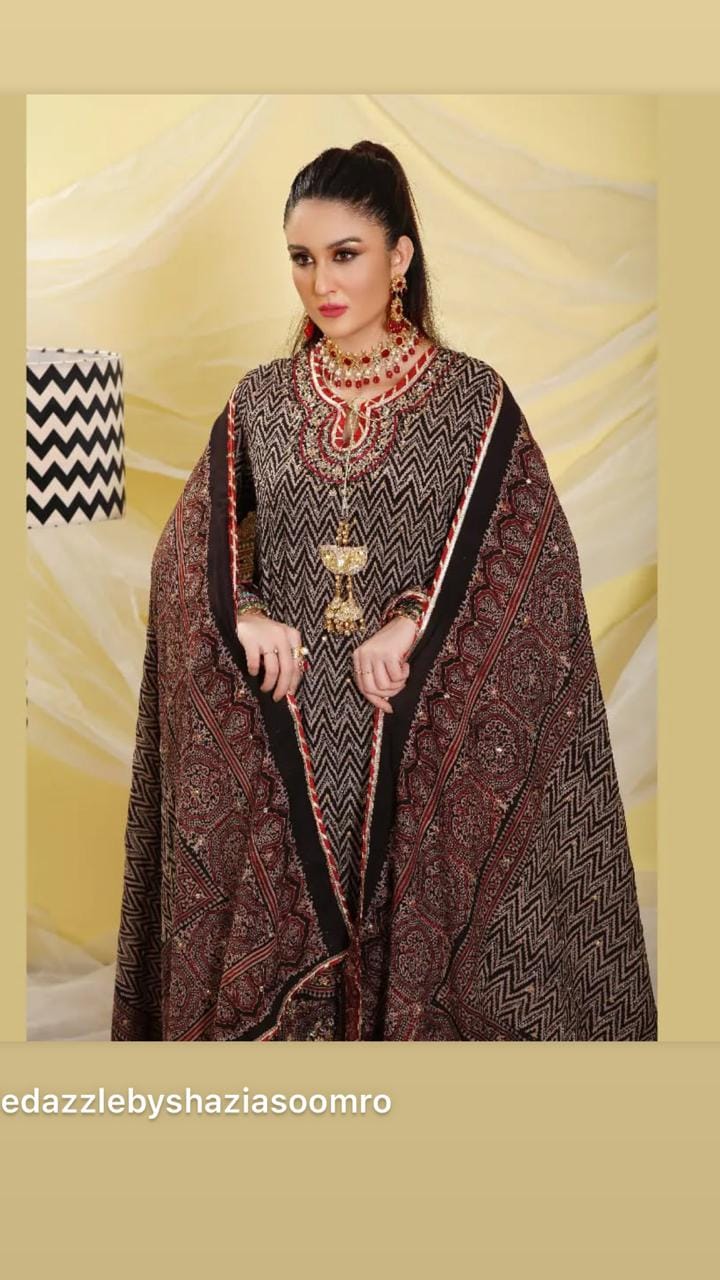 Ajrak Chevron hand block printed silhouette in Hyderabadi neckline with heavy detailing of zardosi,tilla, gotta, sequins, beads, dabka and diamonties. paired with straight pants and duppata is finished with banarsi borders, laces and gotta.