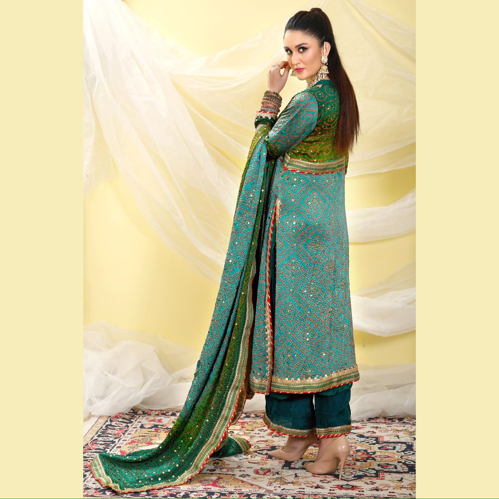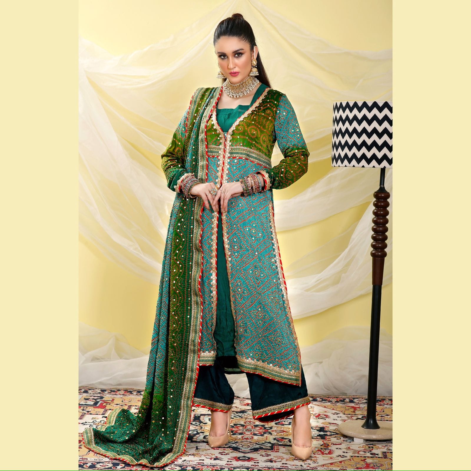 light & dark ombré shade of green silk Chunri outfit, featuring Kamdani work,